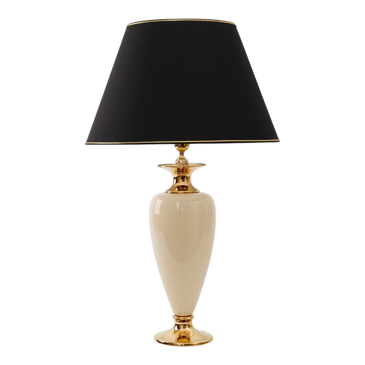 Luxus trifft trifft auf klassische Formen - diese wundervolle Keramik-Tischleuchte bietet eine prunkvolle und dennoch fast schon puristische Optik die begeistert. Die schlanke und edle Silhouette wird durch die elegante Farbgebung und die glanzvollen Akzente aus echter 24-Karat Gold-Veredelung besonders hervorgehoben. Diese Leuchte wird in hochwertiger Handarbeit einzeln produziert und wurde von der stilsicheren italienischen Designer-Marke Lunatre produziert. Eine rundum elegante Kreation, welche stets einen luxuriösen Blickfang bietet.