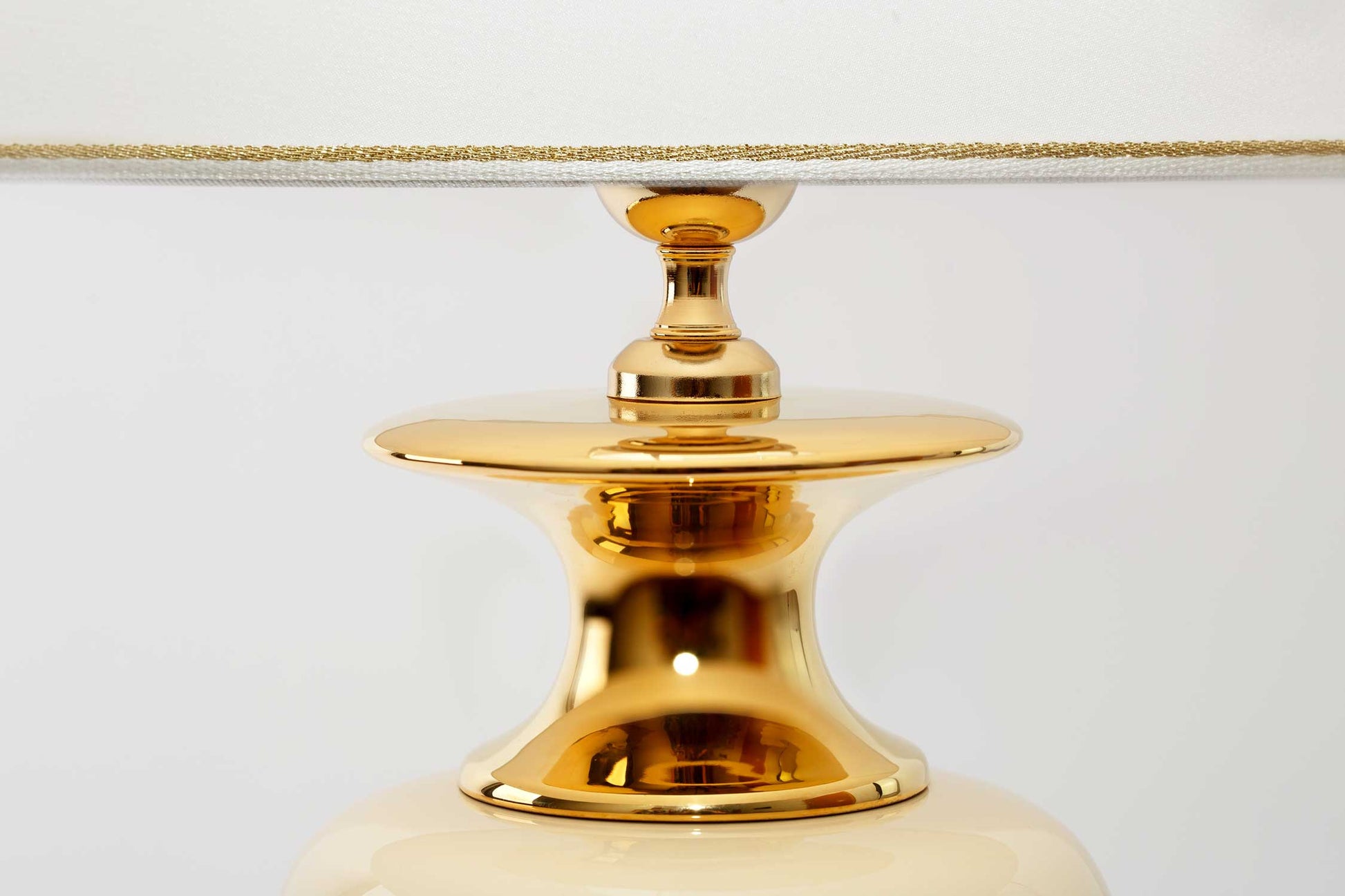 Luxus trifft trifft auf klassische Formen - diese wundervolle Keramik-Tischleuchte bietet eine prunkvolle und dennoch fast schon puristische Optik die begeistert. Die schlanke und edle Silhouette wird durch die elegante Farbgebung und die glanzvollen Akzente aus echter 24-Karat Gold-Veredelung besonders hervorgehoben. Diese Leuchte wird in hochwertiger Handarbeit einzeln produziert und wurde von der stilsicheren italienischen Designer-Marke Lunatre produziert. Eine rundum elegante Kreation, welche stets einen luxuriösen Blickfang bietet.