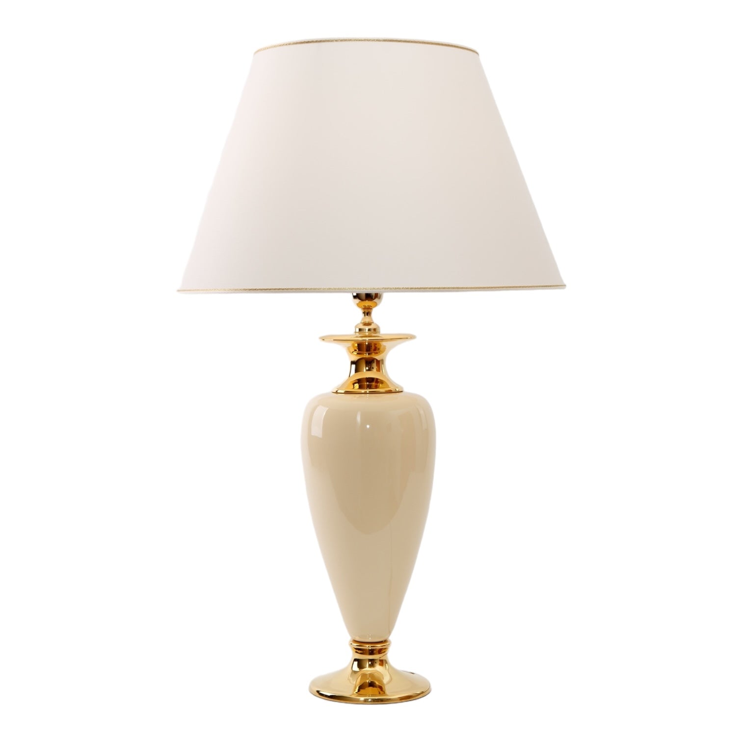 Diese zeitlose Tischleuchte vereint schlichte Eleganz mit luxuriösen goldenen Details. Sie bringt stilvolle Raffinesse in jeden Raum und sorgt für ein warmes, einladendes Ambiente. Ideal für ein elegantes Wohn- oder Schlafzimmer.