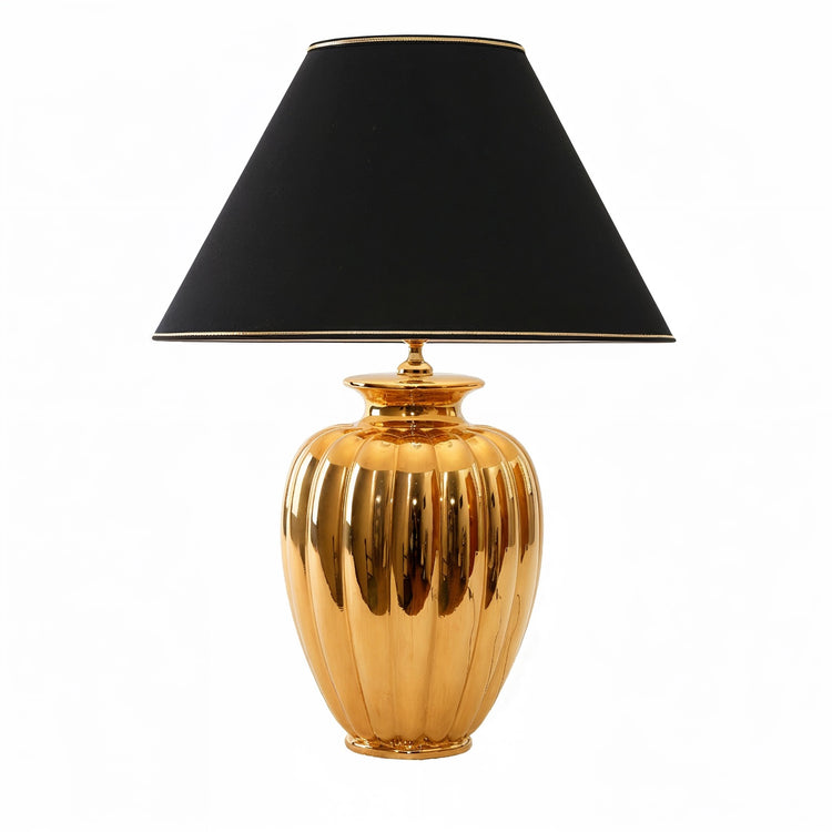 Die Palazzo Keramik-Tischleuchten von Lunatre werden in Italien in präziser Handarbeit gefertigt. Jedes Exemplar ist somit ein mit Hingabe produziertes Unikat. Immerhin wird auch jede einzelne Lampe wird mit einer 24-Karat-Gold-Veredelung versehen - das entspricht einem Feingehalt von 99,9%.